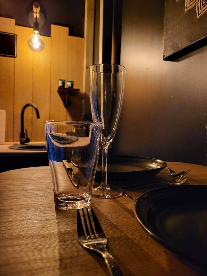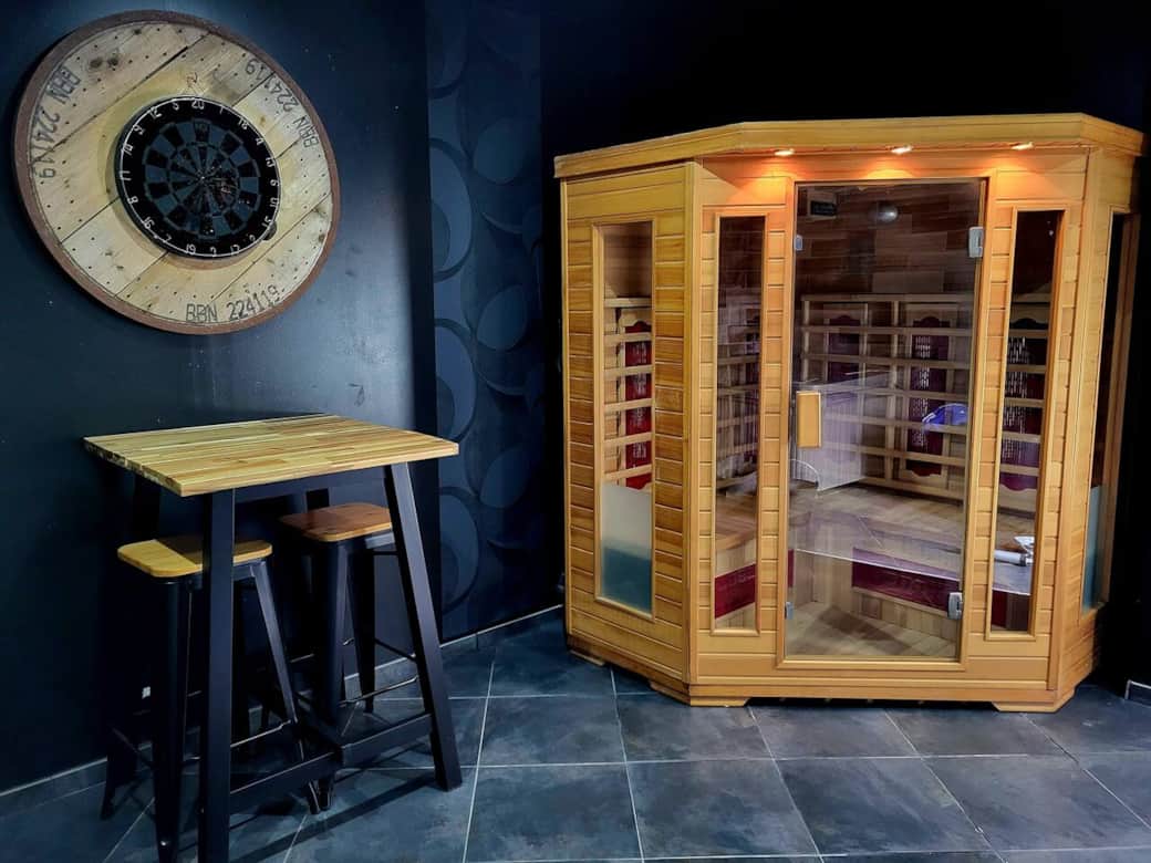 - La pièce principale ou vous retrouverez le SPA, le SAUNA, le coin cuisine avec micro-ondes, frigo, cafetière (Tassimo), mange debout avec tabouret. L'écran géant est face au SPA, mais vous pouvez également en profitez en vous installant dans les fauteuils club. Des jeux de sociétés sont à votre disposition, ainsi qu'un jeu de fléchettes. Un Bar à sirop est en accès libre