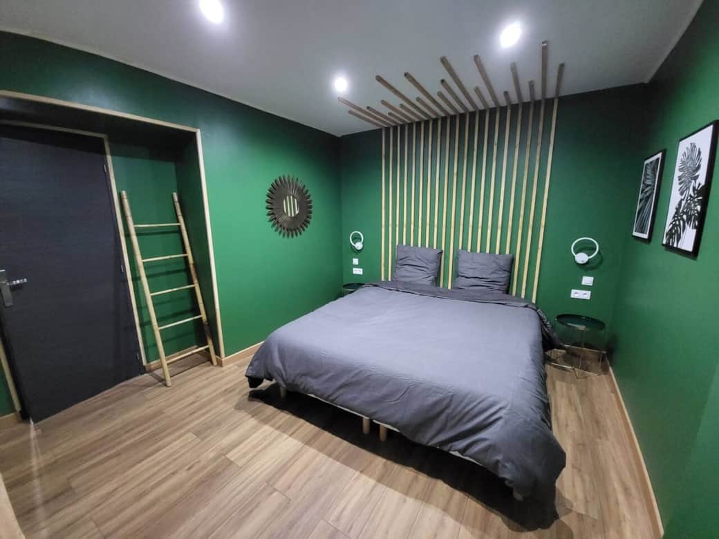 - La chambre dans laquelle prend place le lit KING SIZE de 180x200 équipé d'un matelas EMMA d'un confort incroyable. De chaque côté du lit vous trouverez une lampe de chevet, ainsi qu'une double prise de courant. La chambre est équipé d'un écran full HD incurvé de chez Samsung avec une Nintendo Switch et Mario kart.