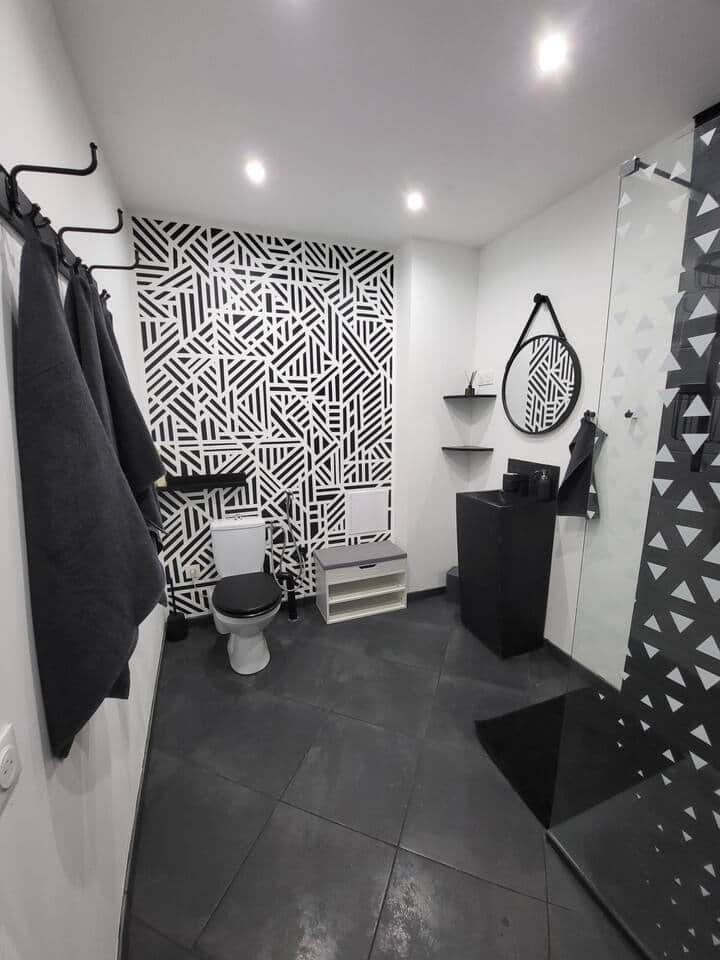 - La salle de douche, avec une douche à l'italienne de 80*120 équipé d'une douchette et d'un plafonnier. Un WC broyeur ultra silencieux et enfin le lavabo avec miroir et prise de courant. Un sèche cheveux est à disposition